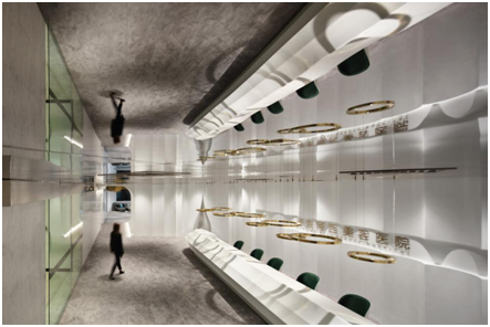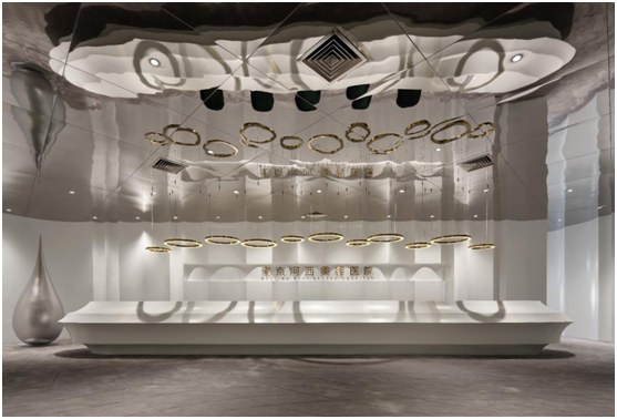 最后,由前厅往至顾客接待区域则是一处弧形的短隧道,让前厅与接待区在空间感官转换上有一定过渡作用。而接待区的天花设计则由前厅延伸于里。