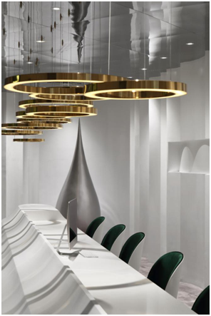 其次,美容机构设计的墙面更是通过堆叠起伏的拼接手法与镜面天花顶交相呼应,营造出空间的未来感和时尚感。而镜面天花的点缀吊饰则为金属质感的圆环吊灯,且采取错落有致的悬挂,提升了整个美容机构设计的艺术科技质感。