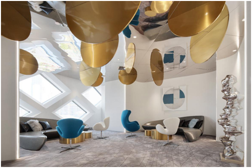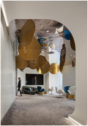 首先,美容机构设计的最大亮点之处便在与它用镜面不锈钢打造的天花顶,在美容机构的前厅至接待厅的公共区域里,肉眼所至之处均为镜面的不锈钢天花顶,设计师利用镜面折射投影的原理,把美容机构设计的公共空间演变出折叠,游离,有规律的光影律动。