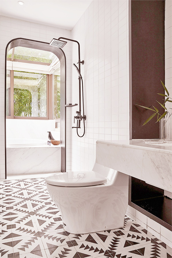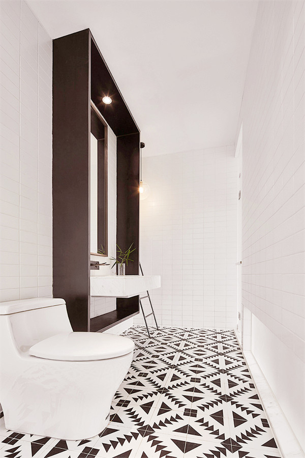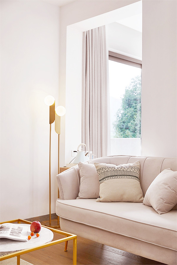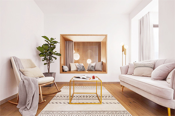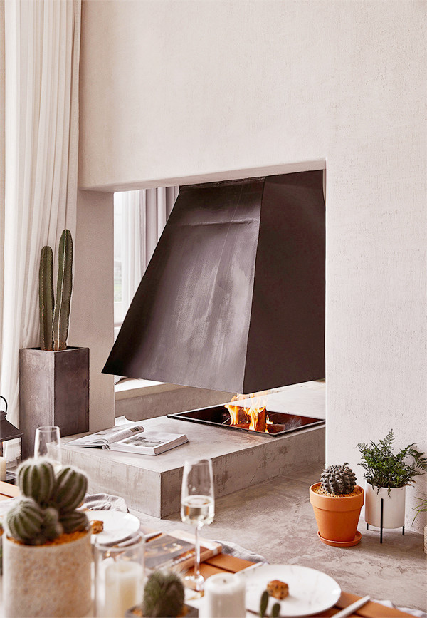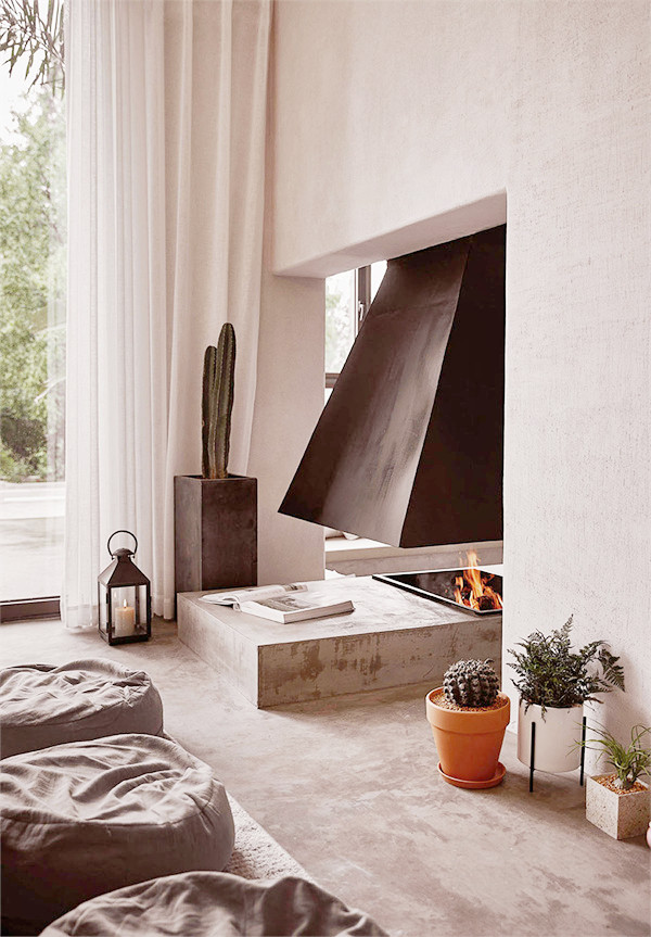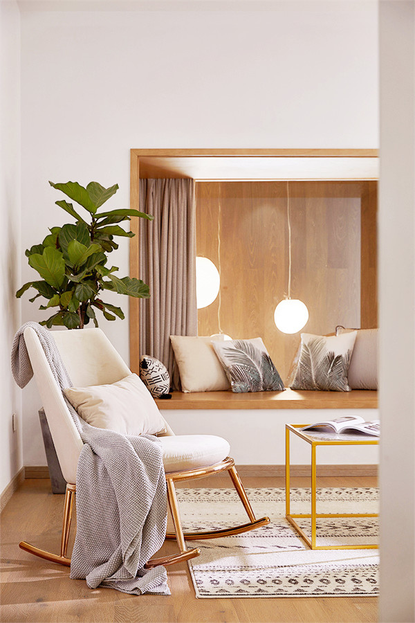 步入室内,将空间做了动静分区,一层原本的房间打通,变成了全开放共享的空间。并且做了下沉式设计,将空间聚焦于此,冬天可以感受火炉带来的温暖,透过拱形的大玻璃眺望远方的风景,享受慵懒自在的时光。墙体与火炉的穿插式设计,提升空间趣味性。